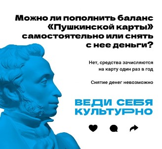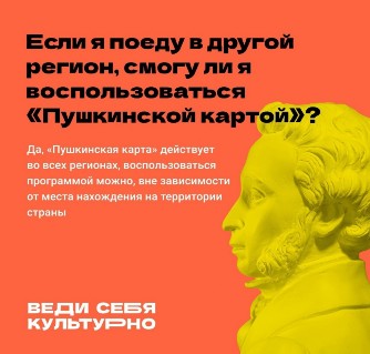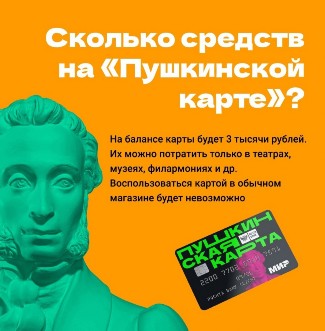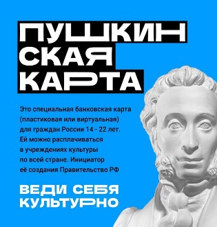 Пушкинская карта – программа популяризации культурных мероприятий среди молодежи от 14 до 22 лет. Получить карту может любой россиянин в возрасте от 14 до 22 лет. Если пользователю программы, имеющему «Пушкинскую карту», в течение календарного года исполнилось 23 года, он имеет право пользоваться картой до 31 декабря владения включительно. Каждая карта персонализирована, то есть она именная и не подлежит продаже или передаче третьим лицам.