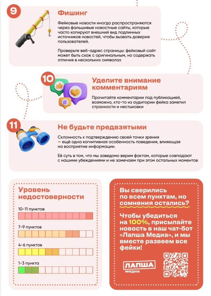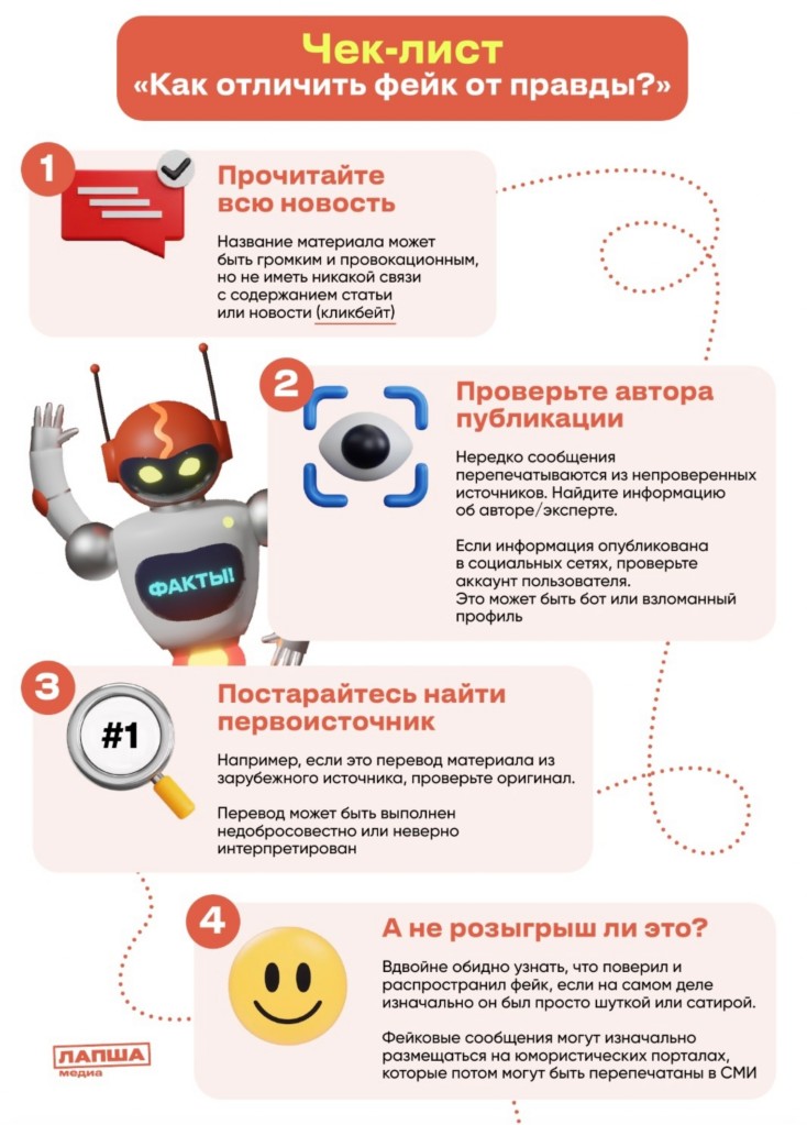 Разработанный «Чеклист по фактчекингу» по основам проверки информации на достоверность от проекта «Лапша Медиа», в котором указан алгоритм верификации информации, может использоваться в социальных сетях или в качестве раздаточных \ печатных материалов.