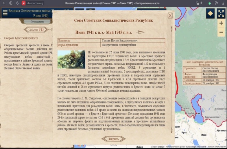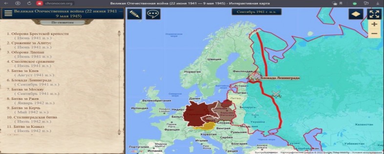 За четыре военных года, прошедших между вероломным вторжением гитлеровских войск в СССР и безоговорочной капитуляцией, прошло огромное количество военных операций. Интерактивная "Карта памяти", созданная учениками 10 класса под руководством Лезгиевой Н.И., расскажет о битвах Великой Отечественной войны, определивших исход всех ее событий.